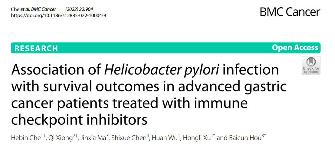 Che H, Xiong Q, Ma J, Chen S, Wu H, Xu H, Hou B. Association of Helicobacter pylori infection with survival outcomes in advanced gastric cancer patients treated with immune checkpoint inhibitors. BMC Cancer. 2022 Aug 19;22(1):904. doi: 10.1186/s12885-022-10004-9. PMID: 35986342; PMCID: PMC9389789.
