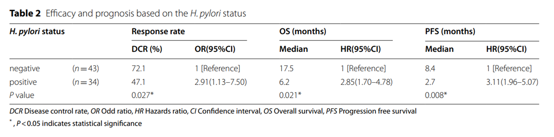 本研究比較了幽門螺桿菌陽性組和幽門螺桿菌陰性組之間疾病控制率(DCR),總生存(OS)和無進展生存(PFS)的差異,以評估幽門螺桿菌感染與抗PD-1抗體治療的AGC患者結局的相關性。
