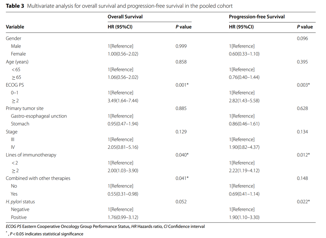 Cox回歸顯示幽門螺桿菌感染與PFS獨立相關(HR = 1.90,95% CI:1.10-3.30;P = 0.022)。盡管幽門螺桿菌感染與OS之間存在相關性(HR = 1.76,95% CI:0.99–3.12),但無統計學意義(P = 0.052)。