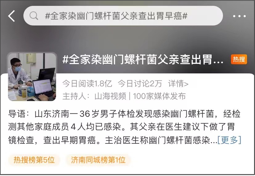 山東濟(jì)南一36歲男子體檢發(fā)現(xiàn)感染幽門螺桿菌,經(jīng)檢測其他家庭成員4人均已感染。其父親在醫(yī)生建議下做了胃鏡檢查,查出早期胃癌,經(jīng)過手術(shù)目前恢復(fù)良好。主治醫(yī)生介紹幽門螺桿菌感染會導(dǎo)致慢性活動性胃炎、消化性潰瘍等疾病,如終生不殺菌約5%的患者會發(fā)生胃癌。醫(yī)生提示,幽門螺桿菌經(jīng)口傳播,個人如發(fā)現(xiàn)感染,建議其他家庭成員一同檢測做主動篩查。醫(yī)院就診或在疫情下選擇居家自測。