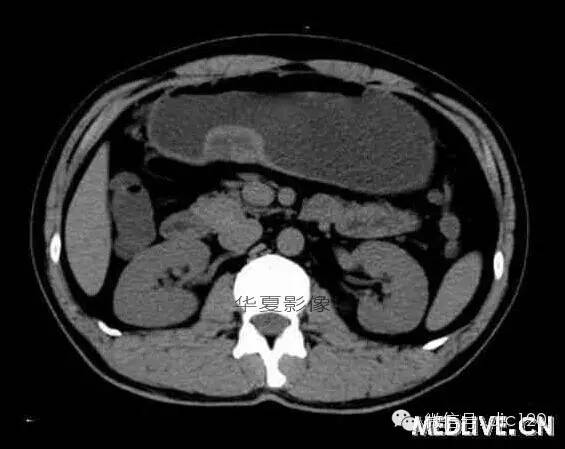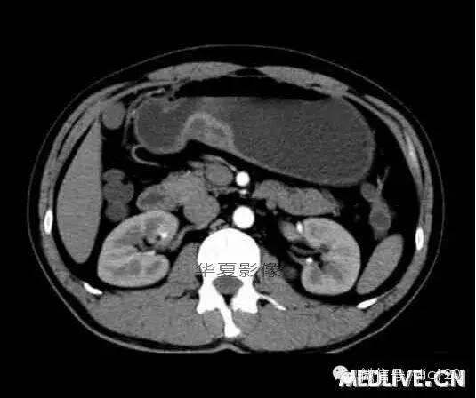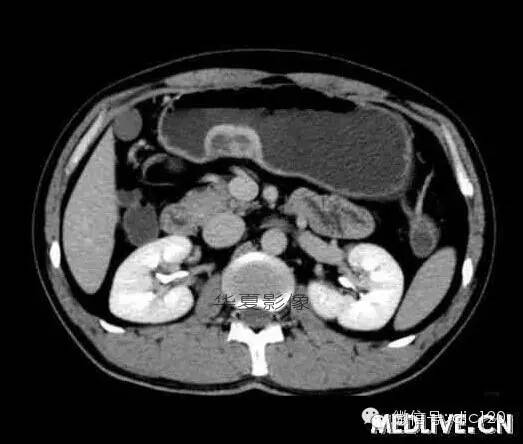 CT檢查可見胃幽門前區胃小彎側胃壁局限性增厚、隆起或伴凸向胃腔內的小結節灶,寬基地,境界光整,注射對比劑,增強掃描后,CT值可達50HU以上,與正常胰腺強化相仿。