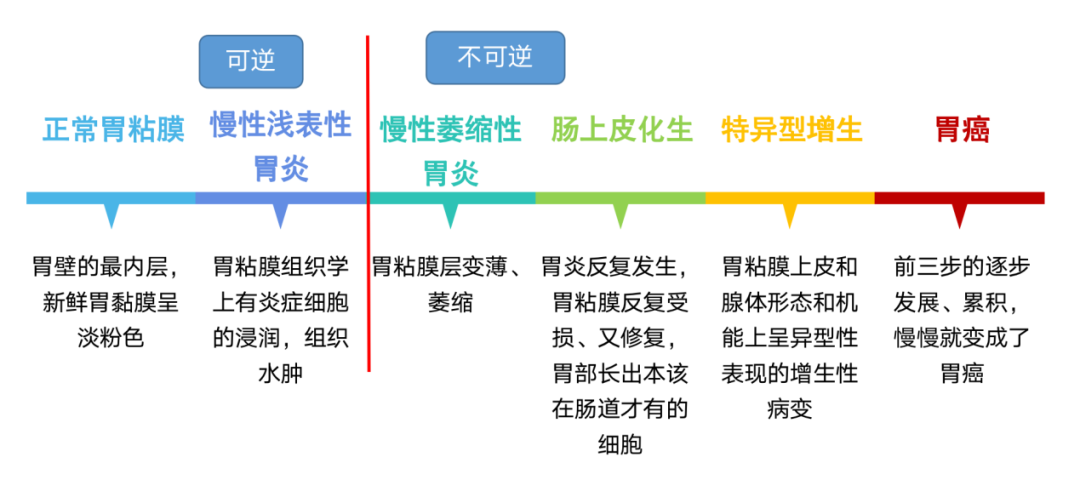 從胃炎到胃癌,只會經過4步。而如果能把疾病控制在早期胃癌之前的任何一個狀態,并加以干預,定期復查,就可以很好的預防胃癌的發生。