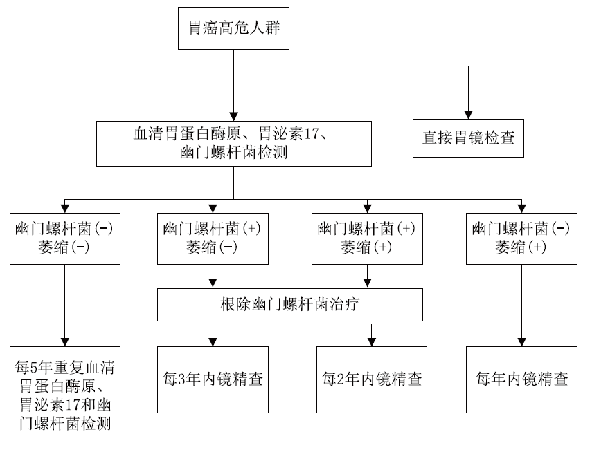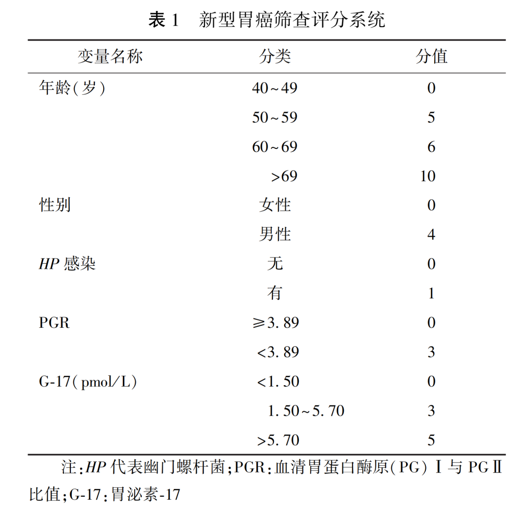 基于對血清胃蛋白酶原和胃泌素17的檢測,結合新型胃癌篩查評分系統可顯著提高篩查效率,對胃癌發生風險最高的人群采取內鏡精查策略,從而提高早期胃癌診斷率。同時可對相對低風險人群采取適合的隨訪策略,節約醫療資源,是改變我國胃癌診治嚴峻形勢的可行且高效的途徑。