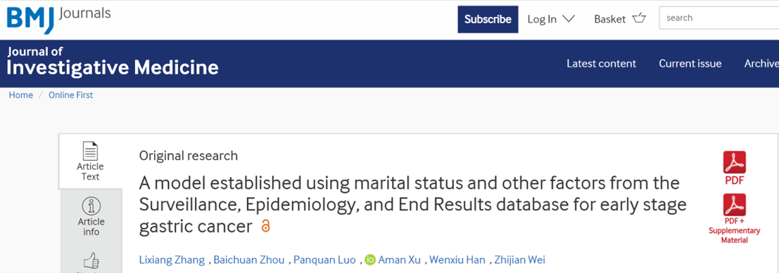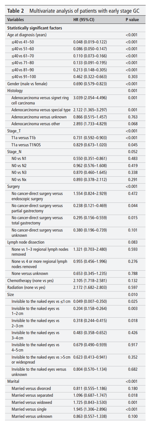 Lixiang Zhang, et al. A model established using marital status and other factors from the Surveillance, Epidemiology, and End Results database for early stage gastric cancer. J Investig Med 2022;0:1–8.