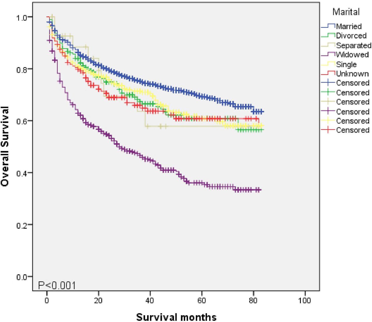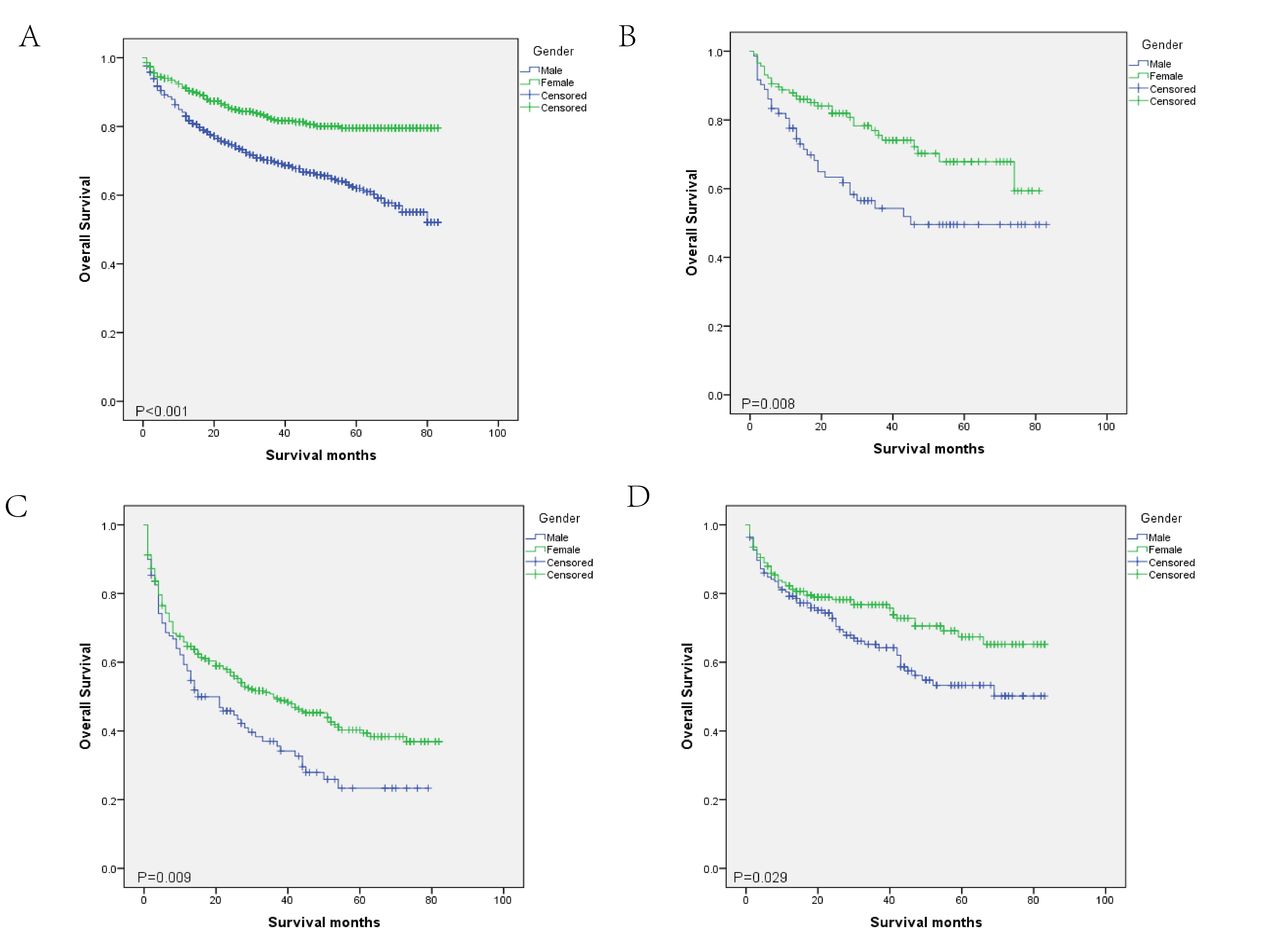 同時,研究人員還對性別中每個已知的婚姻狀況組進行了Kaplan-Meier分析。如圖4所示,每個婚姻狀況組的男性和女性患者之間存在顯著差異(已婚,p<0.001,圖4A;離婚,p=0.020,圖4B;喪偶,p=0.025,圖4C;單身,p=0.026,圖4D)。女性患者的生存率高于男性患者。