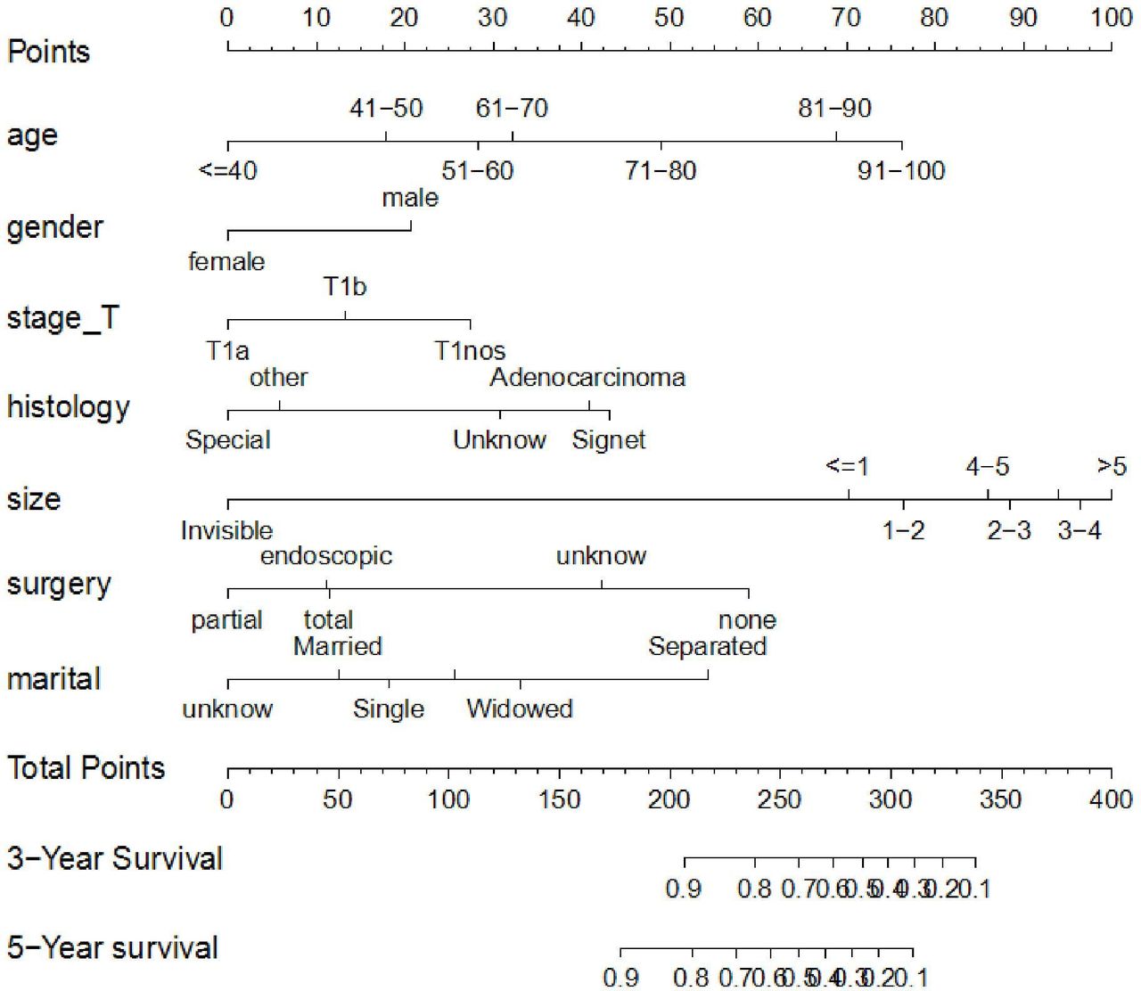 雖然婚姻狀況是一個很少參加GC研究的因素,在本研究的列線圖中也顯示出對生存的中等影響。已婚患者預后最好,其次是單身患者,分居患者的預后最差。這一結果與Kaplan-Meier生存曲線一致。研究人員推測,這可能是由于已婚患者有更好的經濟條件和情感鼓勵,而分居患者可能更容易經歷經濟和情緒的困境。