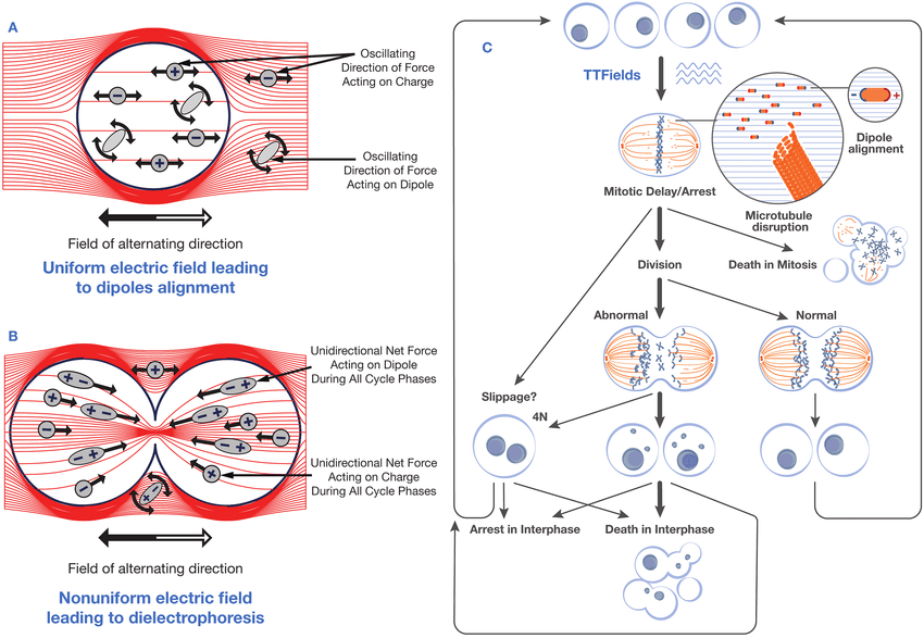 相比于健康細胞,癌細胞會迅速且不受控制得進行有絲分裂,因此可以調(diào)整腫瘤電場治療的頻率特異性地影響癌細胞,同時使健康細胞幾乎不受影響。