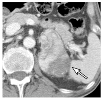 一名67歲的男性,患有乙狀結腸癌。增強CT圖像顯示左腎上腺有一個74毫米的結節(箭頭)。腎上腺切除術后,該結節被證實為腎上腺皮質癌。結腸癌經息肉切除術后確認為PT1期