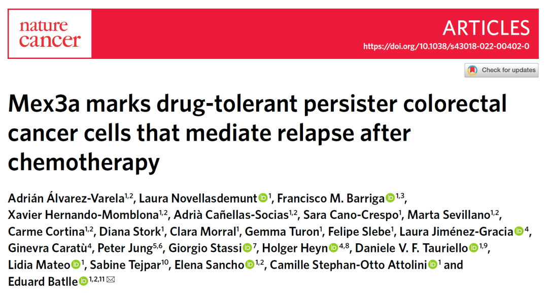 álvarez-Varela, A., Novellasdemunt, L., Barriga, F.M. et al. Mex3a marks drug-tolerant persister colorectal cancer cells that mediate relapse after chemotherapy. Nat Cancer (2022). https://doi.org/10.1038/s43018-022-00402-0.