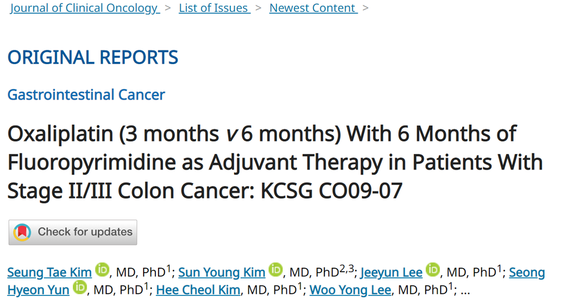 Kim ST, Kim SY, Lee J, Yun SH, Kim HC, Lee WY, Kim TW, Hong YS, Lim SB, Baek JY, Oh JH, Ahn JB, Shin SJ, Han SW, Kim SG, Kang SY, Sym SJ, Zang DY, Kim YH, Choi IS, Kang JH, Kim MJ, Park YS. Oxaliplatin (3 months v 6 months) With 6 Months of Fluoropyrimidine as Adjuvant Therapy in Patients With Stage II/III Colon Cancer: KCSG CO09-07. J Clin Oncol. 2022 Jun 30:JCO2102962. doi: 10.1200/JCO.21.02962. Epub ahead of print. PMID: 35772045.