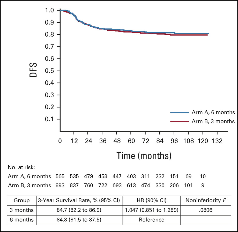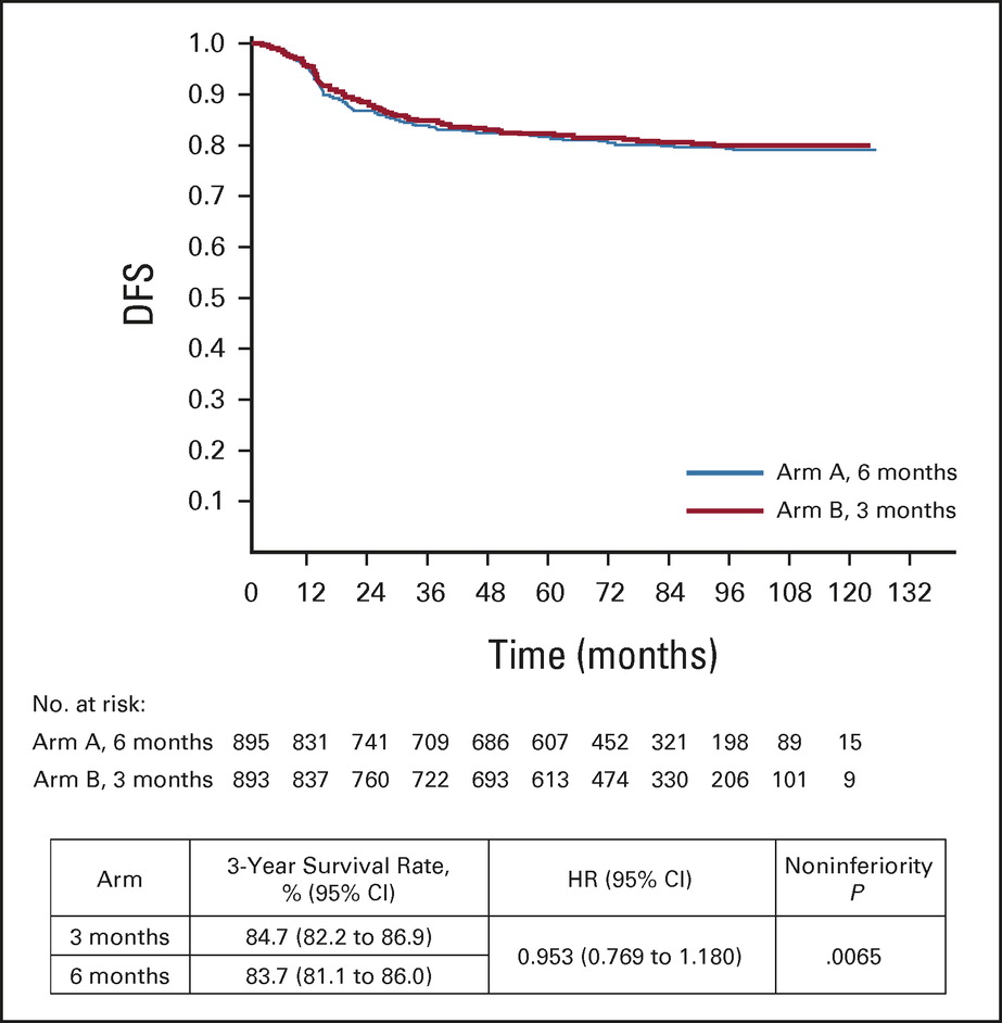 共1788例患者被隨機分配到6個月組(n = 895)和3個月組(n = 893),其中6個月組和3個月組分別有83.6%和85.7%的患者完成了治療。6個月組任何級別的神經病變率均高于3個月組(69.5% v 58.3%; P < .0001)6個月和3個月組的3年DFS率分別為83.7%和84.7%,HR為0.953 (95% CI, 0.769 - 1.180;非劣效性檢驗,P = 0.0065)。