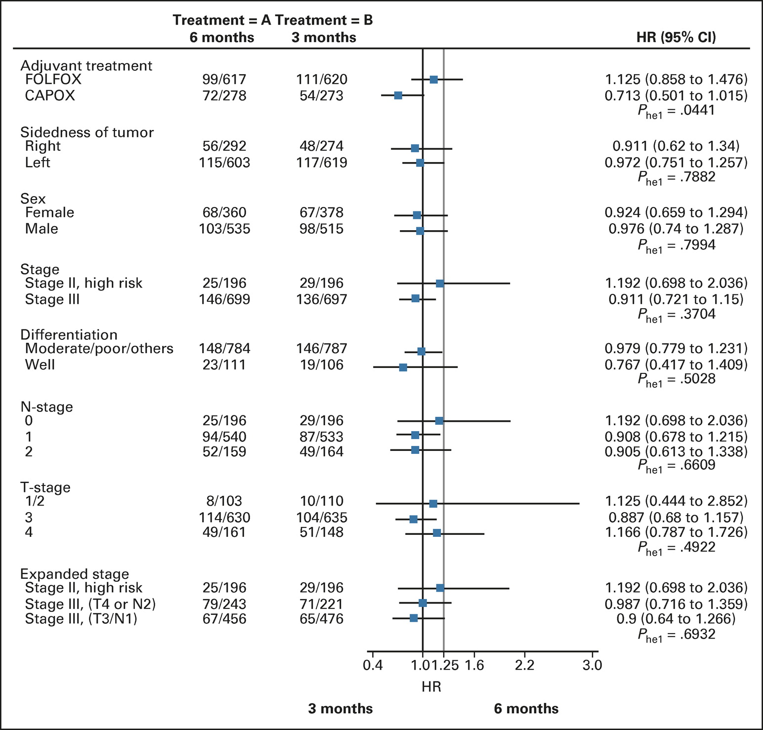 這項開放標簽、隨機、III 期、非劣效性試驗將高危 II 期和 III CRC 患者隨機分配到 3 個月和 6 個月的奧沙利鉑組,以及 6 個月的氟嘧啶組(分別為 3 個月和 6 個月組)。主要終點是無病生存期(DFS),非劣勢邊際是1.25的風險比(HR)。