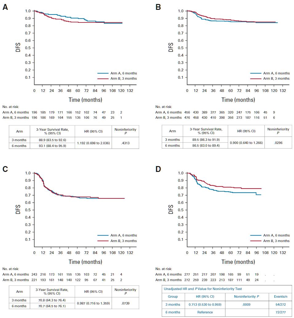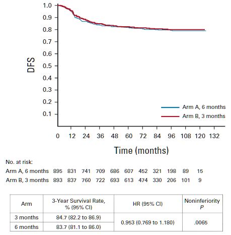 總體上,共有1788位患者被隨機分至6個月組(n=895位)或3個月組(n=893);6個月組和3個月組分別有83.6%和85.7%的患者完成了治療。6個月組的任何級別的神經毒性的發生率高于3個月組(69.5% vs 58.3%,p<0.0001)。6個月組和3個月組的3年DFS率分別是83.7%和84.7%(HR 0.953, p=0.0065),在非劣效性邊界內。