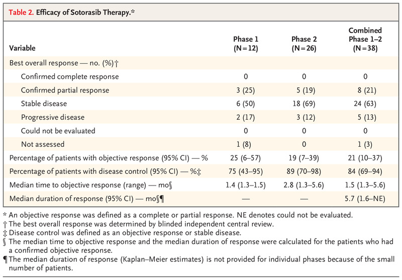 1 期的主要目標(biāo)是評(píng)估安全性并確定 2 期的推薦劑量。在 2 期,患者每天口服一次 960 毫克的 sotorasib。 第 2 階段的主要終點(diǎn)是中央確認(rèn)的客觀反應(yīng)(定義為完全或部分反應(yīng))。 在兩個(gè)階段的合并人群中評(píng)估療效終點(diǎn),包括客觀反應(yīng)、反應(yīng)持續(xù)時(shí)間、達(dá)到客觀反應(yīng)的時(shí)間、疾病控制(定義為客觀反應(yīng)或疾病穩(wěn)定)、無進(jìn)展生存期和總生存期。 還評(píng)估了安全性。