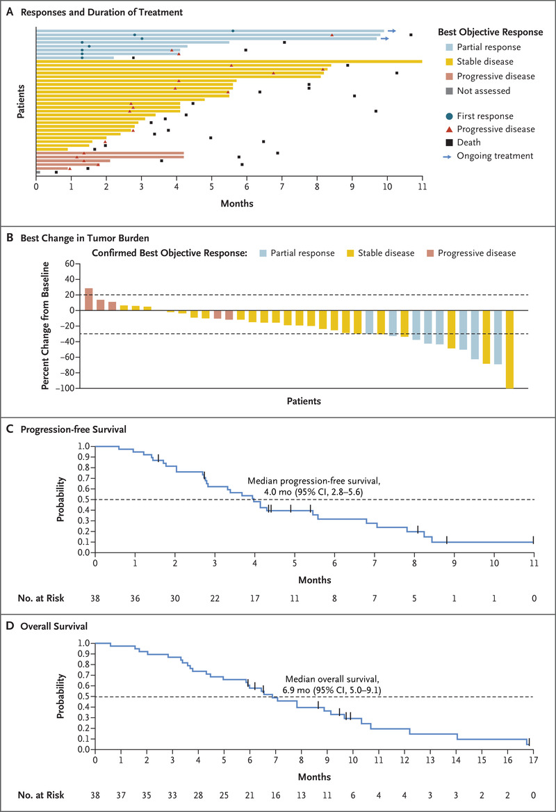 在 30 名患者 (79%) 中觀察到任何大小的目標(biāo)病變的腫瘤縮小(圖 1B)。 圖 S3 提供了根據(jù)研究者評(píng)估的目標(biāo)病灶的腫瘤縮小情況。