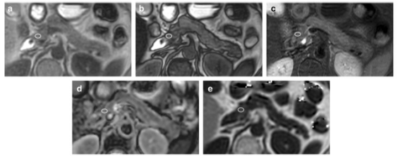 66 歲女性,胰腺正常組脂肪肝。 感興趣區域 (ROI) 的測量在胰腺頭部進行軸同相成像 (a)、軸反相成像 (b)、軸 T2 加權成像 (T2WI) (c)、軸表觀擴散系數 (ADC) 圖 (d) 和軸向多回波 3D DIXON (e)