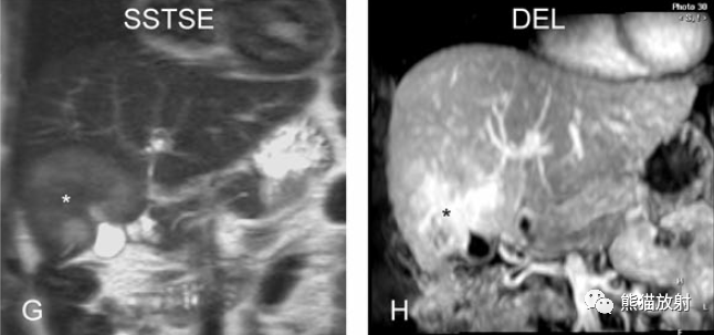 T2壓脂(T2 fatsat):膽囊窩內膽囊癌病變較肝臟為高信號,病變頂部向肝內擴展;