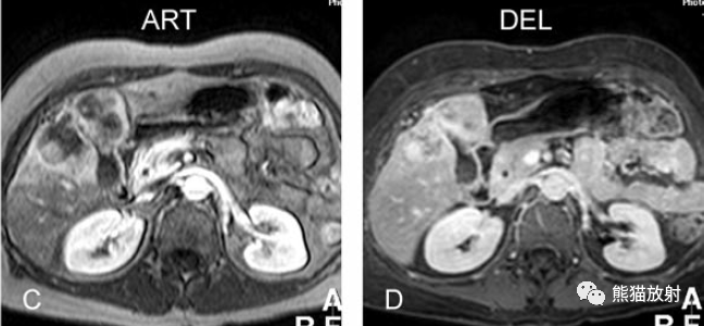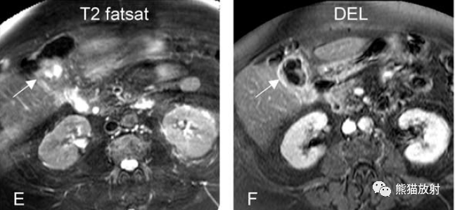 另一例膽囊癌,T2WI及增強延遲期顯示膽囊壁不均勻增厚并明顯強化。