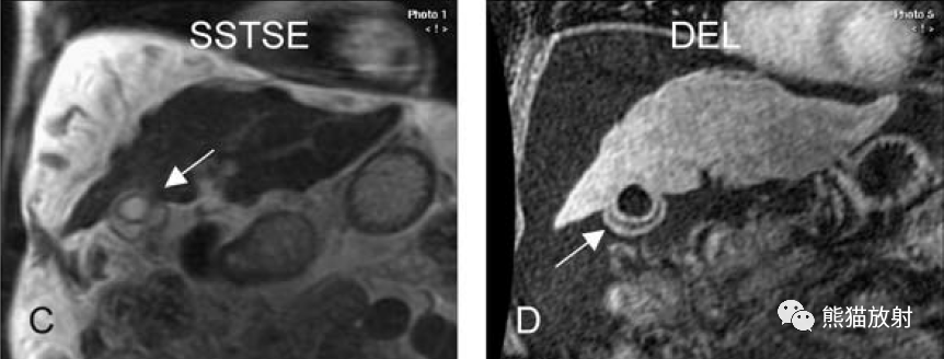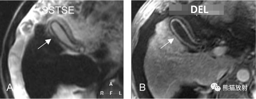 膽囊壁增厚(并肝硬化、門脈高壓、腹水)。T2WI顯示膽囊壁因水腫而光滑均勻增厚,增強延遲期顯示強化的膽囊壁(內外兩層:粘膜層和漿膜層),薄而清晰光滑。