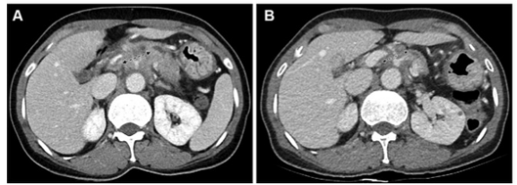 圖 患有胰腺導管腺癌的54歲女性患者的CT圖像,為第一組的代表性示例(CT和CA 19-9反應者)。(A) 基線增強CT圖像顯示胰腺體處有一個30毫米的腫塊,包繞腹腔動脈和肝總動脈(箭頭)。該腫塊為局部晚期狀態。基線CA 19-9水平為391.9 U/ml。(B)使用5-氟尿嘧啶、亮丙瑞林、伊立替康和奧沙利鉑或FOLFIRINOX一線治療8周后獲得的后續對比增強CT圖像。由于腫塊的大小略微下降到27毫米(箭頭),根據實體瘤的反應評價標準,治療反應被歸類為疾病穩定(CT反應者)。由于CA 19-9水平也降至29.2 U/mL,低于37 U/mL的臨界值,患者被歸類為CA 19-9反應者。沒有進行手術切除。在獲取數據時,該患者還生存,總生存期為44.7個月