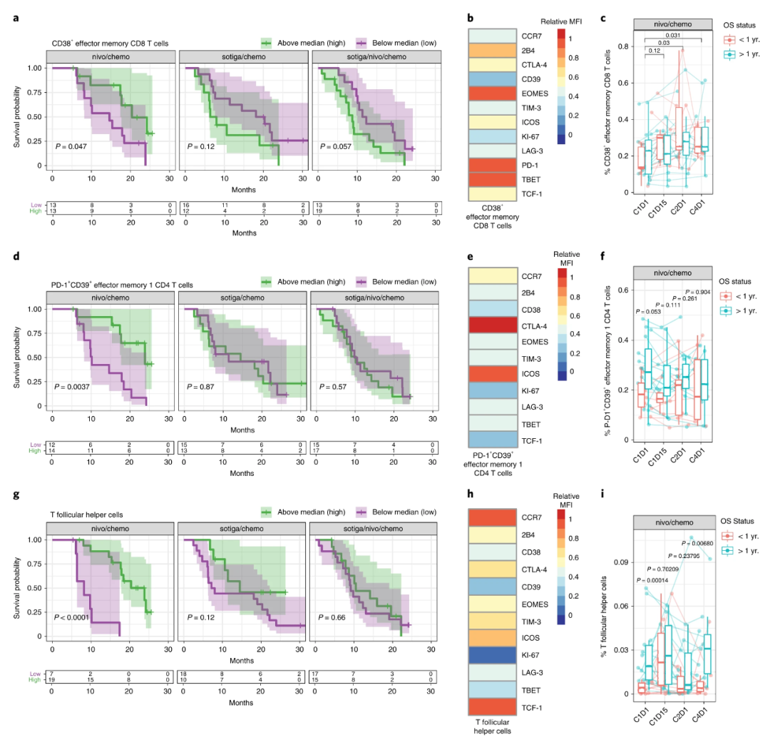 隨后研究人員對生存獲益顯著的免疫檢查點抑制劑nivolumab+化療組患者的T細胞進行了檢測,研究結果發現:該組患者之所以1年生存率有較大幅度提高,和免疫活性循環T細胞有密切的聯系——接受該聯合組治療后生存期大于1年的患者,其效應記憶CD8+ T細胞出現較高頻率的活化,同時CD4+ T細胞以及T 濾泡輔助細胞 (T fh)細胞也更多。