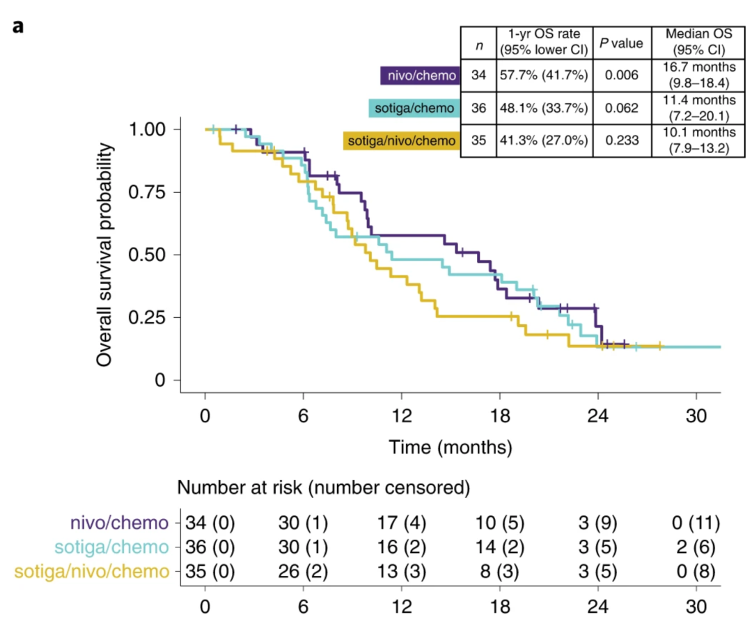 根據研究結果顯示,相較于僅接受化療的患者來說,三組患者的1年生存率都有所提升。其中最明顯的則是免疫檢查點抑制劑nivolumab+化療組,患者的1年總生存率達到了57.7%,提升了64.8%,數據顯著提高(另外研究人員表示三聯組效果差可能和T細胞過度激活從而進入到耗竭狀態有關)。