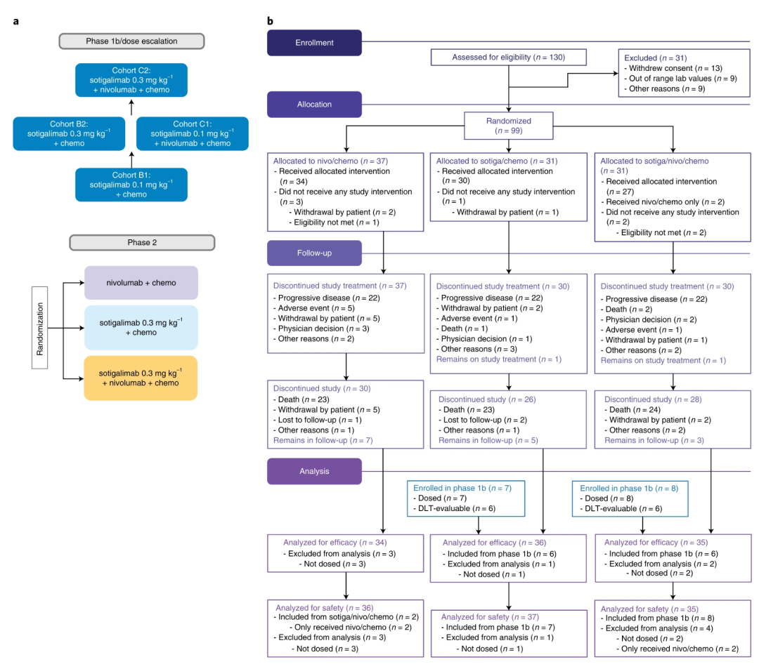 本次研究納入了從2018年8月30日至2019年6月10日入組的99名患者,并隨機分配到3個治療組中,分別為免疫檢查點抑制劑nivolumab+化療組、CD40 激動劑抗體Sotigalimab+化療組以及三聯治療組(CD40 激動劑抗體Sotigalimab+免疫檢查點抑制劑nivolumab+化療)。整體的臨床試驗設計如下圖所示: