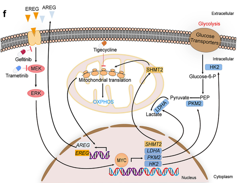 為了進一步闡明肝癌細胞耐受替加環素作用的分子機制,研究團隊對替加環素處理的肝癌細胞進行了轉錄組測序、受體酪氨酸激酶陣列分析及酶聯免疫吸附測定,發現替加環素不敏感肝癌細胞在替加環素作用下,EGFR的兩種配體AREG和EREG自分泌增多并激活EGFR-ERK1/2信號通路,進而導致MYC下游糖酵解相關酶己糖激酶2(HK2)、丙酮酸激酶2(PKM2)和乳酸脫氫酶(LDHA)表達及活性增強。此外,研究團隊還發現EGFR-ERK1/2-MYC信號軸可通過激活絲氨酸羥甲基轉移酶2(SHMT2)部分維持線粒體翻譯功能。