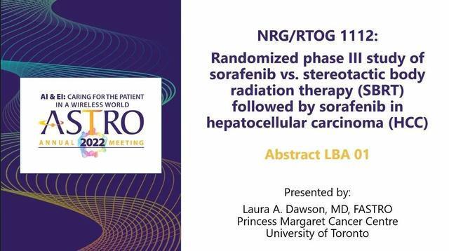 Dawson LA, Winter KA, Knox JJ, et al. NRG/RTOG 1112: Randomized phase II study of sorafenib vs. stereotactic body radiation therapy (SBRT) followed by sorafenib in hepatocellular carcinoma (HCC) (NCT01730937). Presented at 2022 American Society for Radiation Oncology Annual Meeting (ASTRO); October 23-26, 2022; San Antonio, TX. Abstract LBA01. Accessed October 24, 2022.