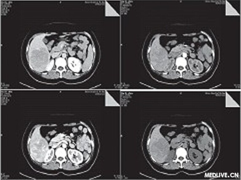 CT檢查平掃示肝右葉見6.6 cm×7.7 cm×8.8 cm塊影,CT值約為49 HU,病變內下緣與右腎上極分界欠清。動態增強掃描動脈期病變內見腫瘤血管影,延遲期呈相對低密度影,三期CT值分別為55.3 HU、85.8 HU、67.5 HU,腹膜后未見腫大淋巴結(如圖1所示)。結論:肝右后葉占位,肝癌可能性大,腹腔積液。