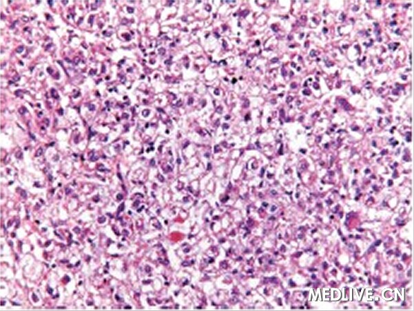 鏡檢(圖2):腫瘤細胞彌漫成片,呈上皮樣,細胞核形態不整,胞漿嗜酸性或透明,可見多核巨細胞。