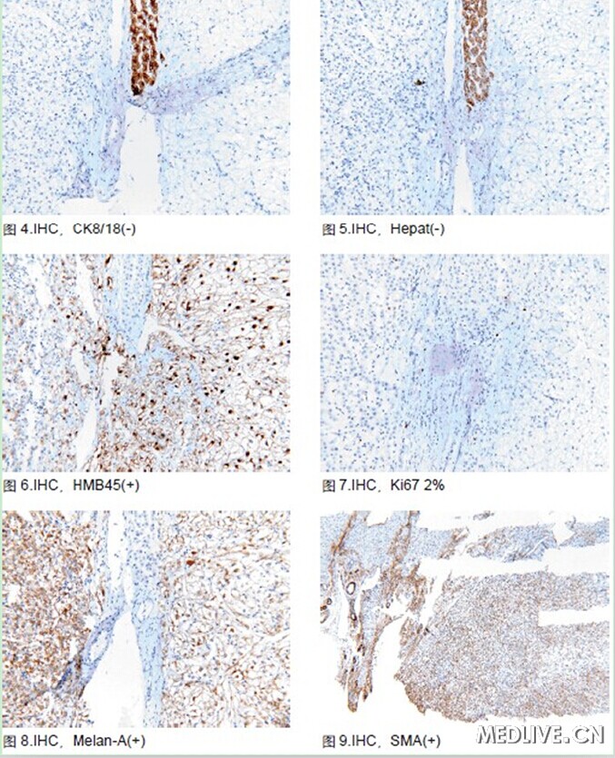 免疫組化染色:如圖3~圖9:CD34內皮細胞(-),腫瘤細胞CK8/18(-),圖中可見殘存肝細胞陽性;腫瘤細胞Hepat(-),殘存肝細胞陽性;腫瘤細胞HMB45(+),而殘存肝細胞陰性;腫瘤細胞Ki67陽性細胞比例<2%;腫瘤細胞Melan-A(+), SMA(+)。