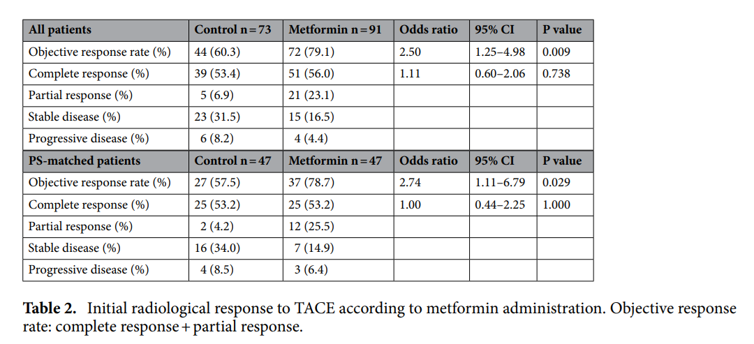 表2顯示初始 TACE 后 4 周根據 mRECIST 標準的總體和 PS 匹配患者的放射學緩解率。二甲雙胍組的客觀緩解(即完全緩解(CR)和部分緩解(PR)之和)率顯著高于對照組: