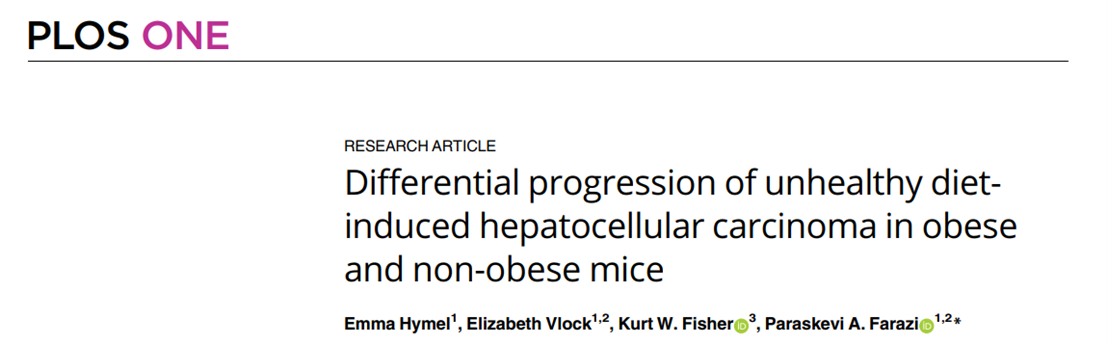 Hymel E, Vlock E, Fisher KW, Farazi PA. Differential progression of unhealthy diet-induced hepatocellular carcinoma in obese and non-obese mice. PLoS One. 2022 Aug 22;17(8):e0272623. doi: 10.1371/journal.pone.0272623. PMID: 35994501; PMCID: PMC9394802.
