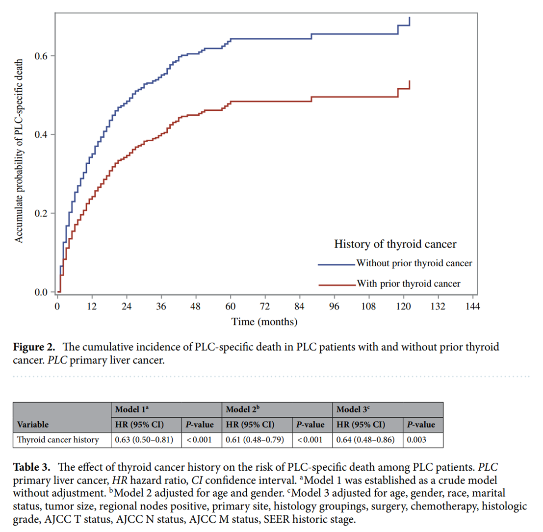總的來說,既往甲狀腺癌可降低 PLC 患者(尤其是女性患者)發生 PLC 特異性死亡的風險。這意味著既往甲狀腺癌可能對PLC的發展有重要影響,研究人員和臨床醫生應更加關注既往甲狀腺癌對其與PLC相關的研究或診斷的潛在影響。