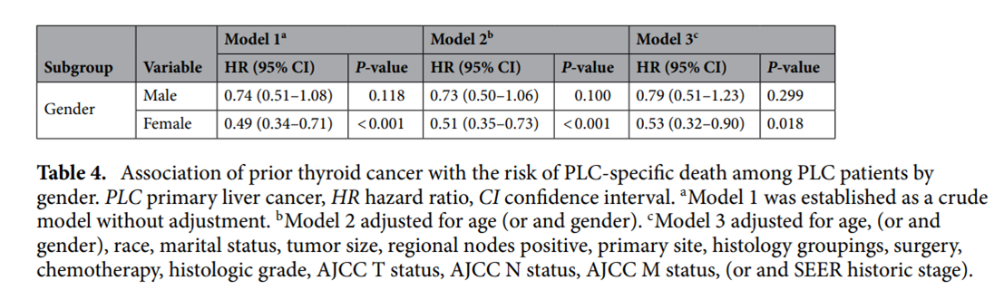 按性別分層的亞組分析顯示,女性患者與PLC的關系相似:既往甲狀腺癌女性患者的PLC死亡風險較低(HR = 0.49;95% CI:0.34–0.71,P < 0.001)。在模型2中,這種差異在上述亞組中仍然顯著。在模型3中,既往甲狀腺癌的潛在保護作用僅在PLC女性患者中發現(HR = 0.53;95%CI:0.32-0.90,P = 0.018)(表4)。