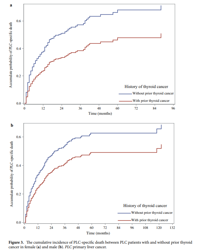 圖3a描述了有和沒有既往甲狀腺癌的女性PLC患者之間PLC特異性死亡的累積發生率。圖3b顯示了有和沒有先前甲狀腺癌的PLC患者之間PLC特異性死亡的累積發生率。既往甲狀腺癌可能是PLC患者肝癌死亡的保護因素,尤其是女性患者。