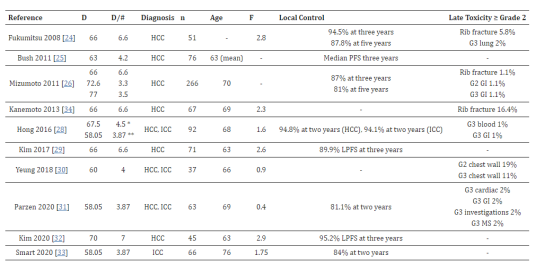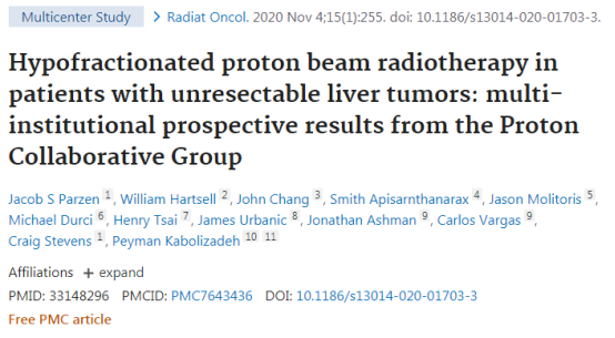 [4]Parzen JS, Hartsell W, Chang J, Apisarnthanarax S, Molitoris J, Durci M, Tsai H, Urbanic J, Ashman J, Vargas C, Stevens C, Kabolizadeh P. Hypofractionated proton beam radiotherapy in patients with unresectable liver tumors: multi-institutional prospective results from the Proton Collaborative Group. Radiat Oncol. 2020 Nov 4;15(1):255. doi: 10.1186/s13014-020-01703-3. PMID: 33148296; PMCID: PMC7643436.