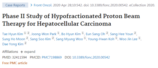[5]Kim TH, Park JW, Kim BH, Oh ES, Youn SH, Moon SH, Kim SS, Woo SM, Koh YH, Lee WJ, Kim DY. Phase II Study of Hypofractionated Proton Beam Therapy for Hepatocellular Carcinoma. Front Oncol. 2020 Apr 28;10:542. doi: 10.3389/fonc.2020.00542. PMID: 32411594; PMCID: PMC7198869.
