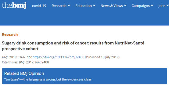 法國巴黎第十三大學的研究人員在頂級醫學期刊BMJ發表了一項題為“Sugary drink consumption and risk of cancer: results from NutriNet-Santé prospective cohort”(圖2)的研究。研究表明,每天飲用100ml含糖飲料會導致人體整體患癌風險增加18%,患乳腺癌風險增加22%[3]。研究總體表明含糖飲料的攝入與總體患癌風險呈正相關,即使果汁也不例外!