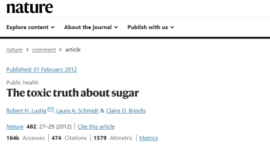 [4]Lustig RH, Schmidt LA, Brindis CD. Public health: The toxic truth about sugar. Nature. 2012 Feb 1;482(7383):27-9. doi: 10.1038/482027a. PMID: 22297952.
