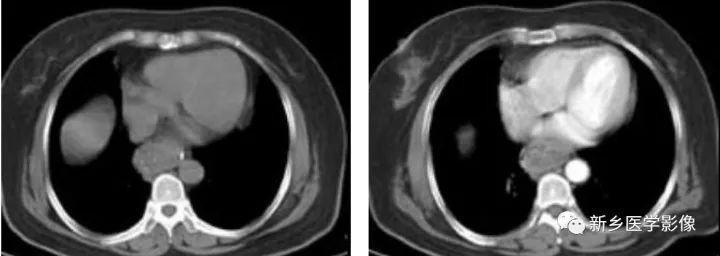 ④轉移:以縱隔、肺門及頸部淋巴結轉移多見,也可逆行性轉移至上腹部淋巴結,少見肺轉移。CT增強掃描可見瘤體輕度強化。較大瘤體呈不均勻強化,常合并低密度的壞死灶,較小瘤體強化均勻。