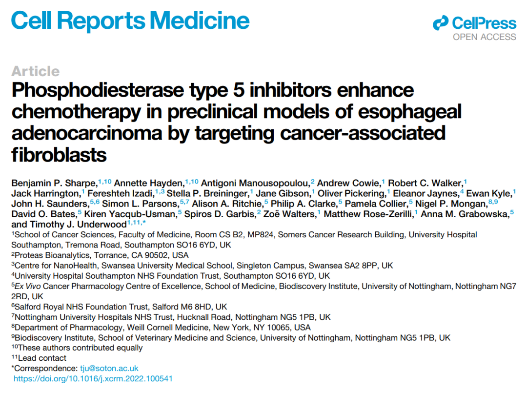 Benjamin P. Sharpe, et al. Phosphodiesterase type 5 inhibitors enhance chemotherapy in preclinical models of esophageal adenocarcinoma by targeting cancer-associated fibroblasts. Cell Reports Medicine, 2022.