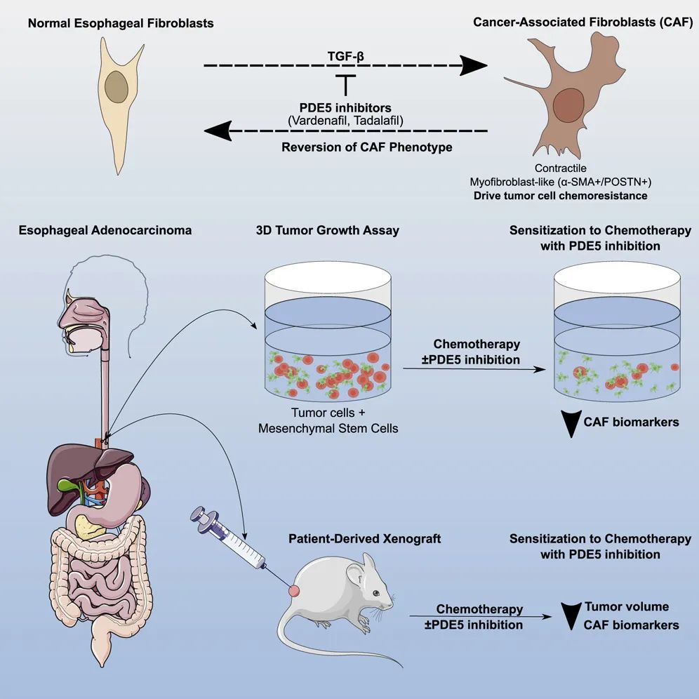 該研究發(fā)現(xiàn),PDE5抑制劑可以通過靶向腫瘤周圍的癌癥相關(guān)成纖維細(xì)胞(CAF),PDE5抑制劑聯(lián)合化療能夠比單獨進(jìn)行化療更好地抑制食管腺癌,逆轉(zhuǎn)食管腺癌的化療耐藥性,而化療耐藥性是食管腺癌治療面臨的主要挑戰(zhàn)之一。