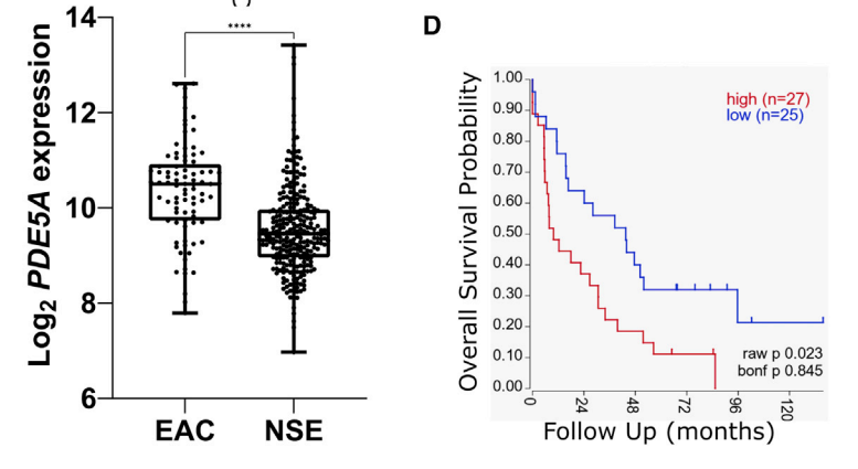 在這項研究中,研究團(tuán)隊發(fā)現(xiàn),與健康的食管組織相比,食管腺癌細(xì)胞中5-磷酸二酯酶(PDE5)顯著高表達(dá),而在腫瘤微環(huán)境中的癌癥相關(guān)成纖維細(xì)胞(CAF)同樣高表達(dá) PDE5。同時,PDE5 的高表達(dá)與較差的總生存率相關(guān),這表明 PDE5 可能是一個有效的食管腺癌治療靶點。