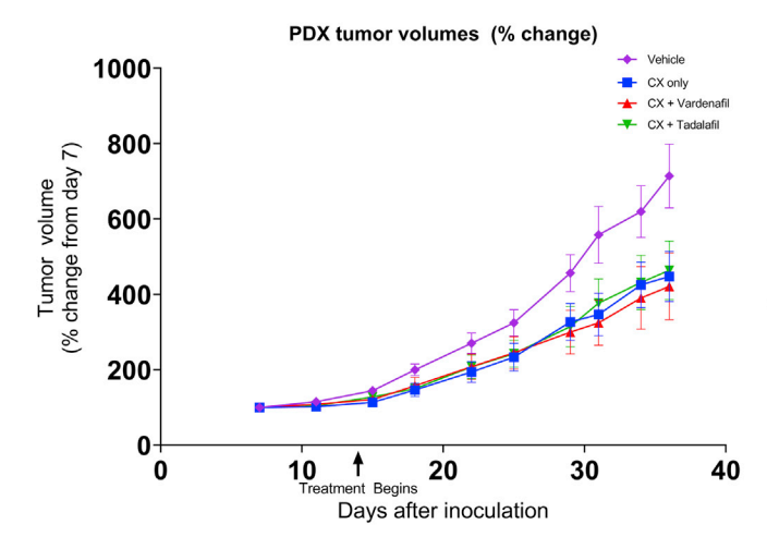 接下來,研究團(tuán)隊從8名食管腺癌患者的15個組織活檢樣本中提取了腫瘤細(xì)胞樣本,并進(jìn)行培養(yǎng),然后對這些體外培養(yǎng)的腫瘤進(jìn)行 PDE5i+標(biāo)準(zhǔn)化療的聯(lián)合治療試驗。在12個臨床中化療反應(yīng)較差的樣本中,有9個通過 PDE5i 靶向 CAF 時的癌細(xì)胞對化療重新變得敏感。
